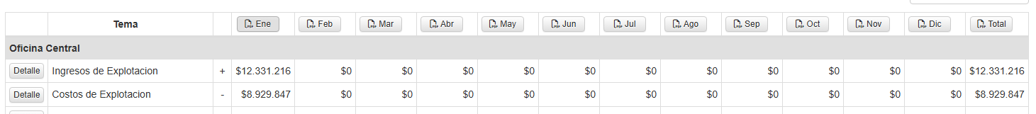 Al presionar el botón detalle el sistema desplegará un cuadro que entregará los mayores por mes y centro de costo para cada cuenta indicada en los parametros del eerr