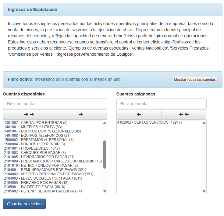 Inicialmente la tabla de cuentas disponibles solo entregará las cuentas que han tenido algún movimiento en su vida útil, el numero indicado entre paréntesis representa la cantidad de veces que la cuenta ha sido usada en un asiento. Para ver el plan completo solo debe presionar el botón "mostrar todas las cuentas".