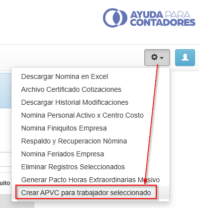 hecho esto debe ir al menu adicionales y seleccionar Crear APVC para trabajador seleccionado