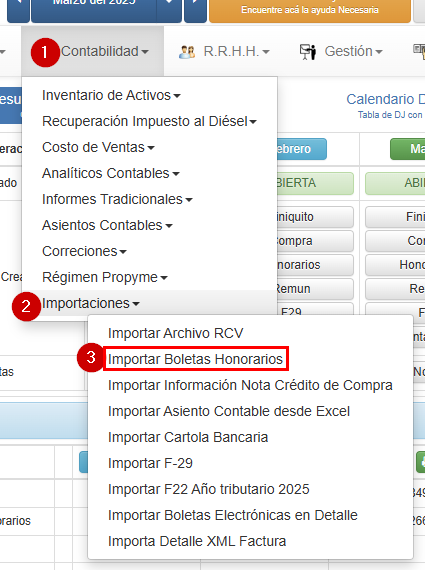 Primero debe ir a este menú, contabilidad->importaciones->Importar Boletas Honorarios