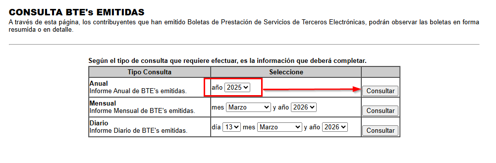 en este recuadro usted deberá indicar el año a consultar y luego presionar el botón consultar, con lo que el servicio informará lo siguiente
