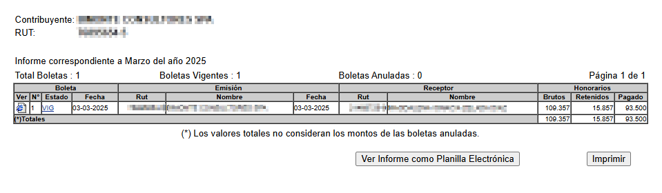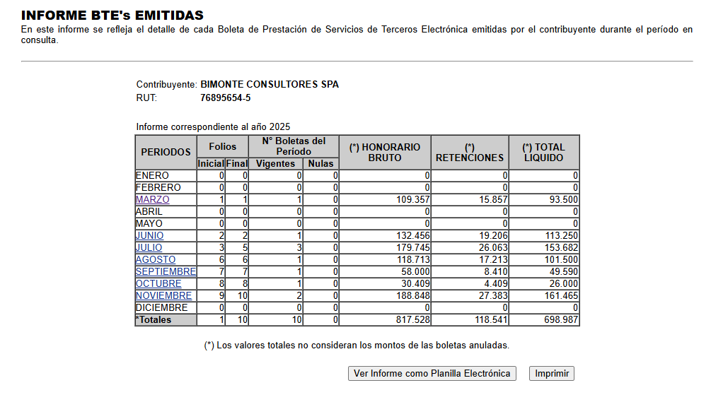 En este recuadro deberá presionar el link del mes correspondiente para que el sistema le entregue un listado de la boletas