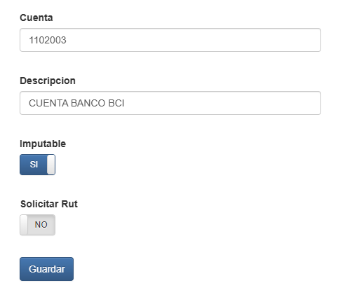 Esta operación entregará un formulario con el siguiente numero de cuenta y esperará que usted ingrese tanto la descripción como si esta cuenta es imputable y necesita rut.